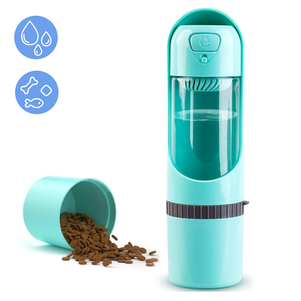 - Butelka składa się z dwóch części i może pomieścić 300 ml wody oraz 100 g karmy lub przysmaków, które znajdują się w osobnych przegródkach, dzięki czemu zaspokoisz pragnienie lub nagrodzisz swojego zwierzaka podczas spacerów, wędrówek lub podróży