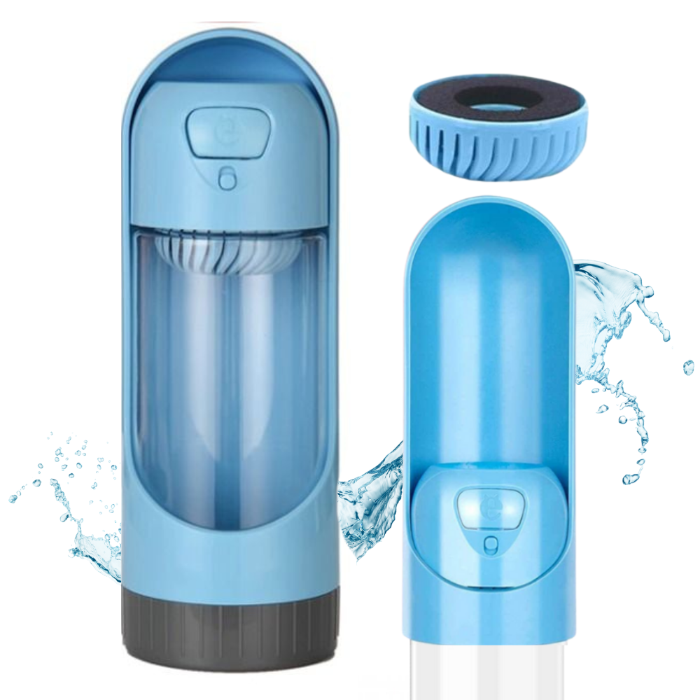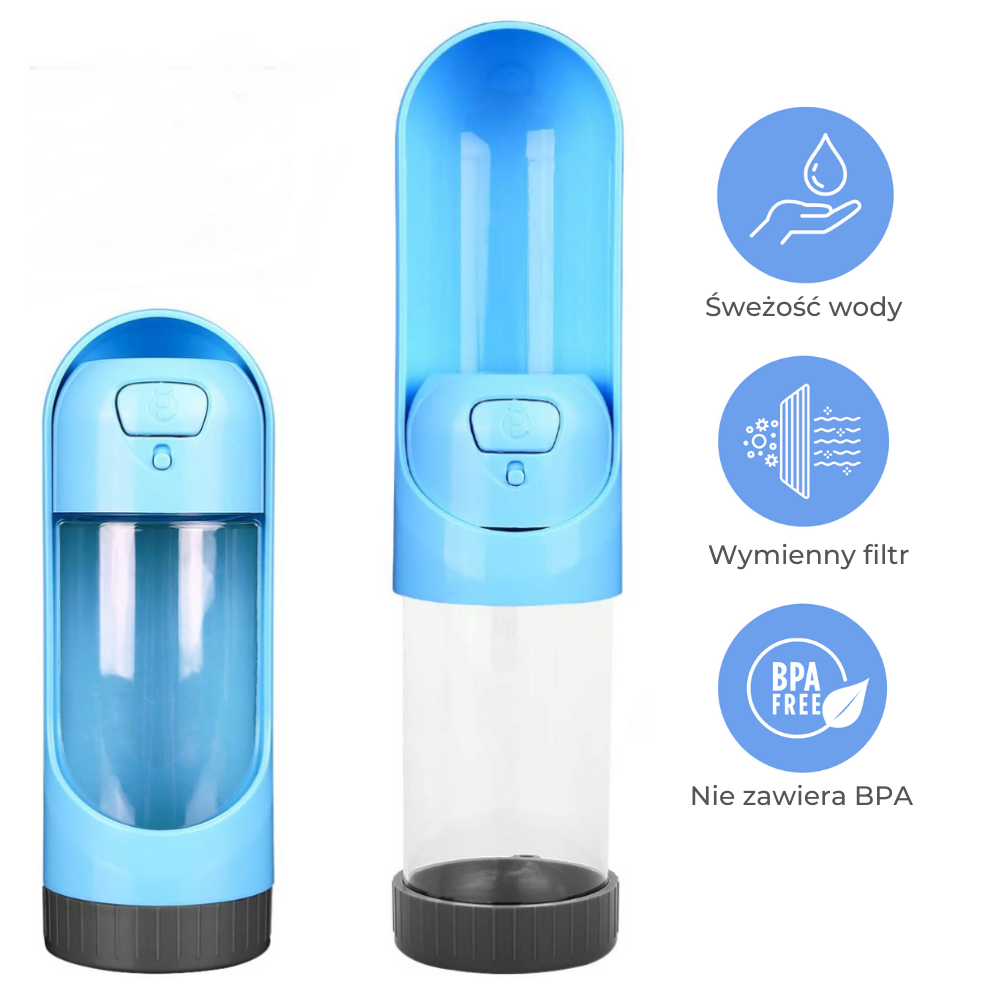 - Butelka podróżna z filtrem węglowym zapewni Twojemu zwierzakowi źródło świeżej, czystej i przefiltrowanej wody podczas spacerów i podróży a Ty zadbasz o zdrowie oraz długie i szczęśliwe życie swojego pupila