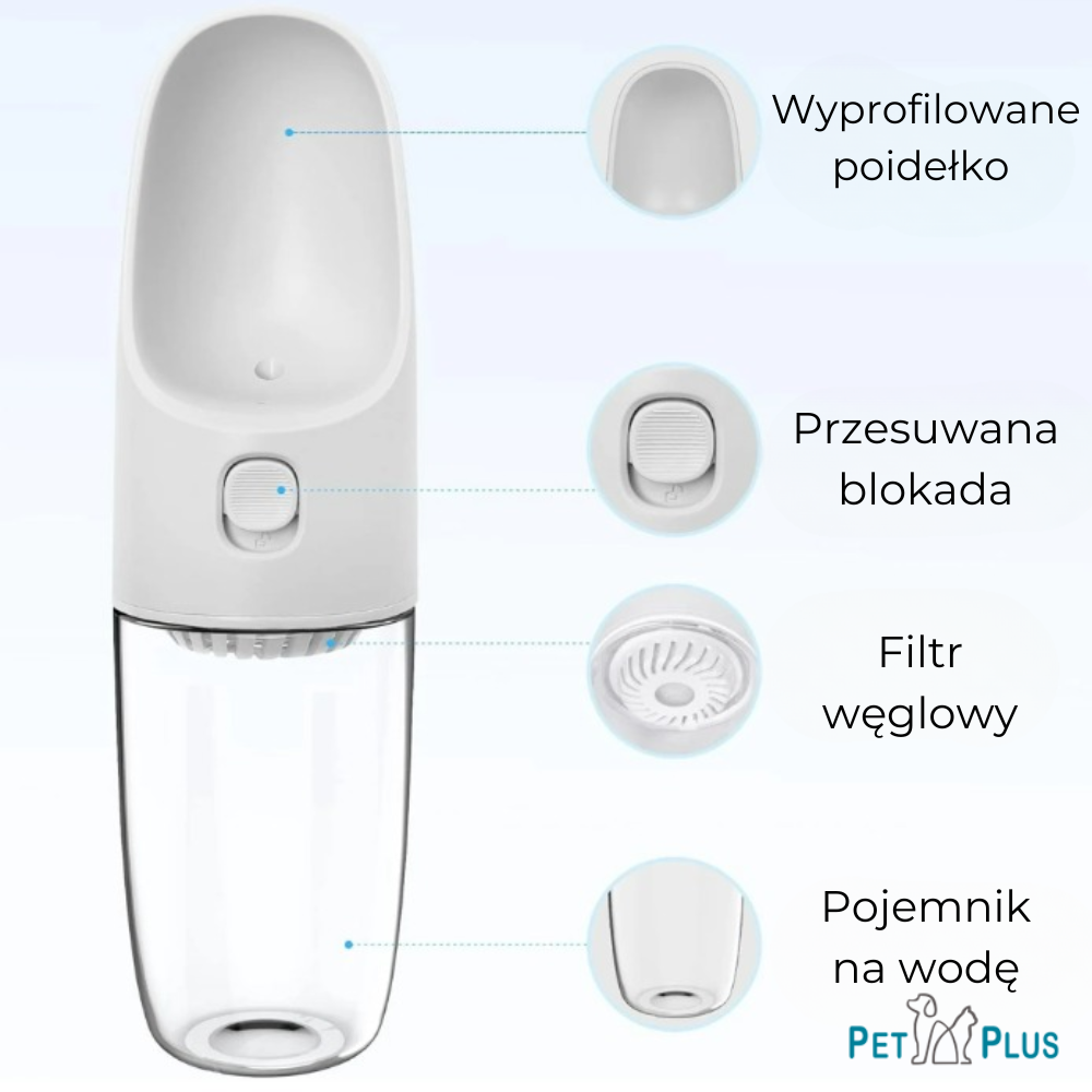 - Butelka podróżna z filtrem węglowym zapewni Twojemu zwierzakowi źródło świeżej, czystej i przefiltrowanej wody podczas spacerów i podróży a Ty zadbasz o zdrowie oraz długie i szczęśliwe życie swojego pupila