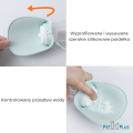 - Po wysunięciu silikonowej miseczki wystarczy nacisnąć umieszczony na górze butelki przycisk i obserwować jak woda delikatnie spływa do poidełka