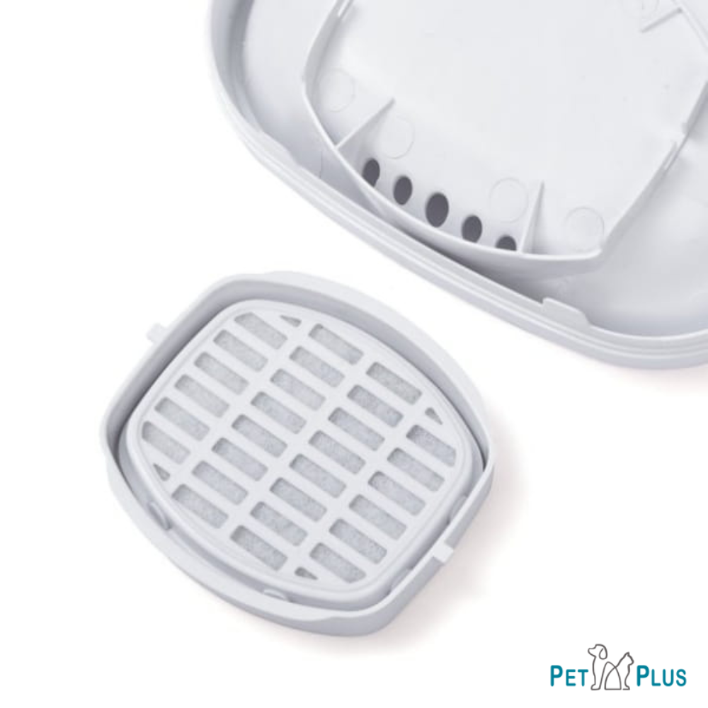 - Urządzenie posiada filtr wymienny o trzystopniowym systemie filtracji (warstwa bawełny, warstwa węgla aktywnego, warstwa bawełny), który usuwa zanieczyszczenia, nieprzyjemny smak i zapach, utrzymując świeżość wody, dzięki czemu jest ona czystsza i smaczniejsza niż woda stojąca w misce. Pompka fontanny chroniona jest dodatkowo przez gąbkę, która wyłapuje większe zanieczyszczenia, tj. włosy, sierść i chroni ją przez uszkodzeniem