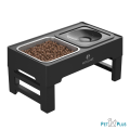 - Stojak wyposażony jest w dwa rodzaje misek: miskę niechlapiącą o pojemności 1,6 l przeznaczoną na wodę i miskę ze stali nierdzewnej na jedzenie o pojemności 1,6 l, która może być wykorzystana do suchej lub mokrej karmy