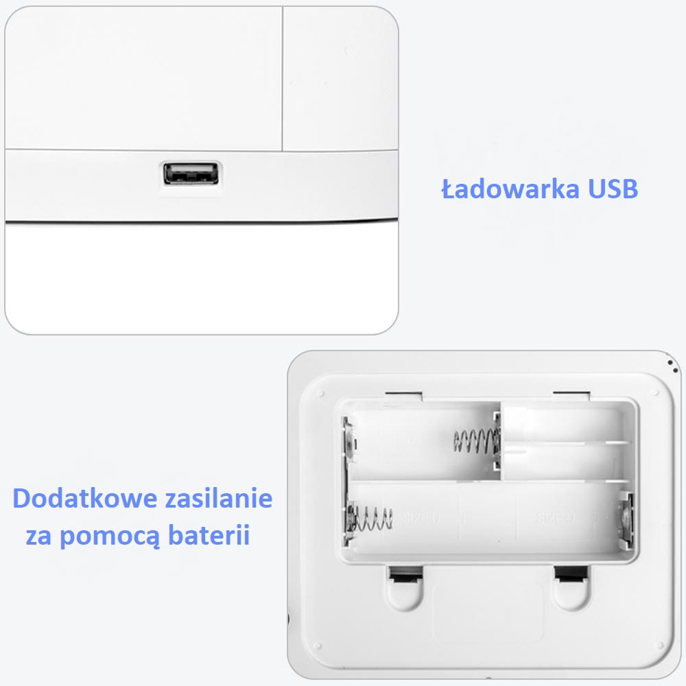 - Zasilanie: ładowarka - port USB-A z przewodem zasilającym o długości 3 m, dodatkowe zasilanie za pomocą baterii (brak w zestawie)