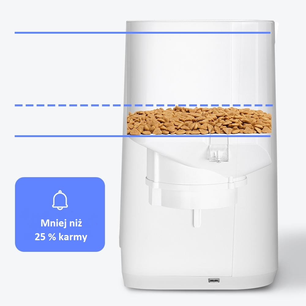 INTELIGENTNY ALARM - kiedy podajnik wykryje mniej niż 25% żywności, powiadomi Cię o tym w aplikacji mobilnej.