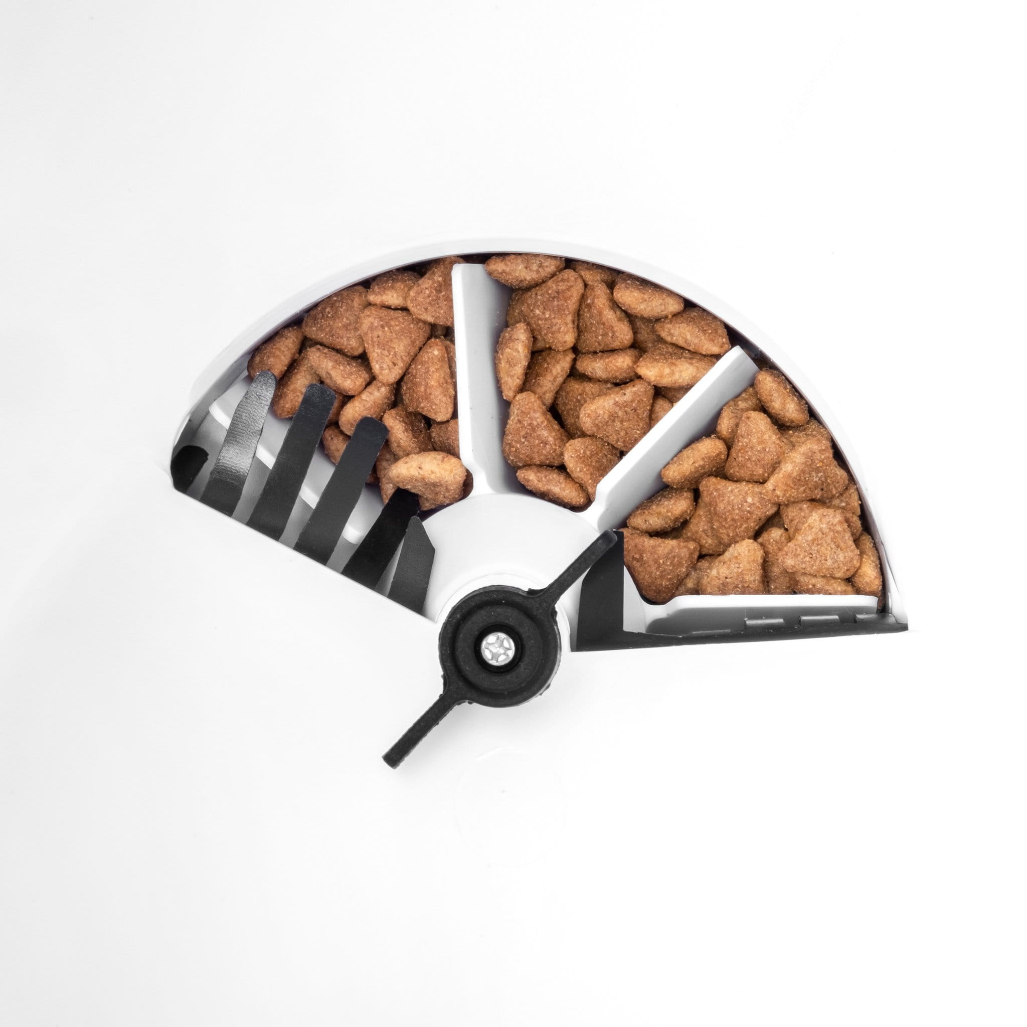 - Ulepszona konstrukcja koła porcyjnego zapewnia równomierne rozprowadzanie karmy bez zapychania się podajnika