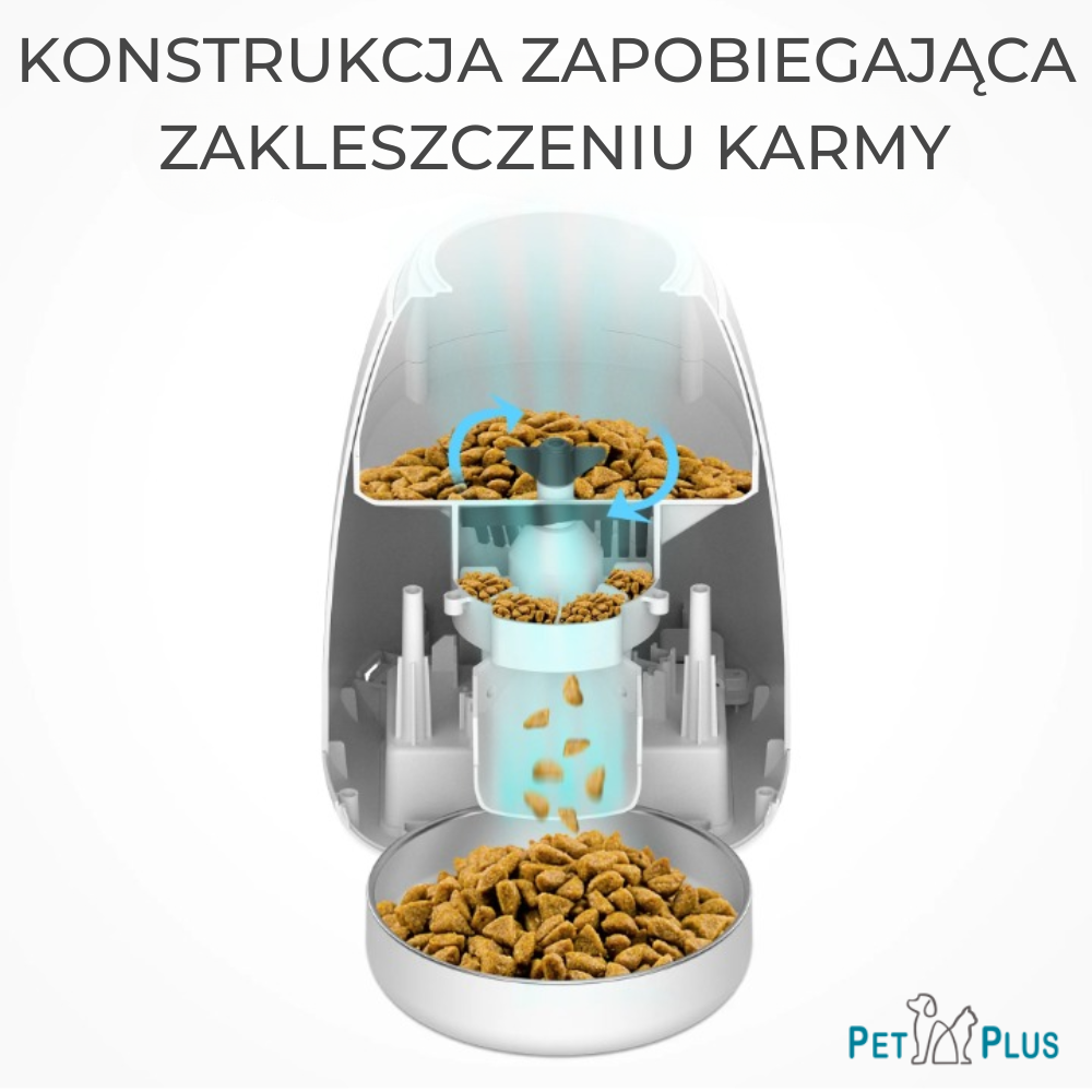 - Urządzenie ułatwia kontrolę porcji, pozwala ustawić dokładną ilość karmy, dzięki czemu zapobiega przejadaniu się zwierząt i pomaga kontrolować ich masę ciała
