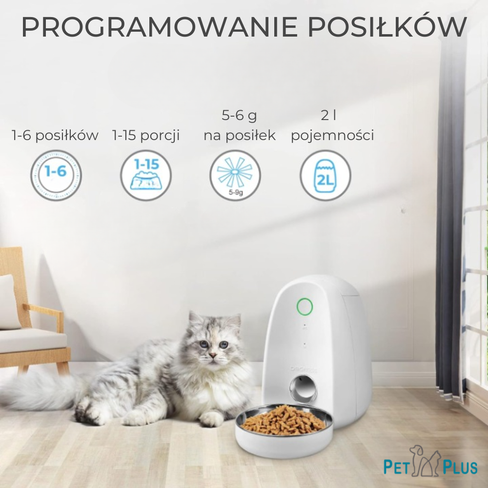 - Automatyczny podajnik karmy dla psów i kotów pozwoli Ci nakarmić Twojego zwierzaka w razie potrzeby lub zgodnie z wcześniej zaprogramowanym harmonogramem posiłków (porcje od 5 do 6 g na posiłek, od 1-15 porcji na posiłek, do 6 posiłków na dzień, które ustalisz dzięki prostej, bezpłatnej aplikacji mobilnej