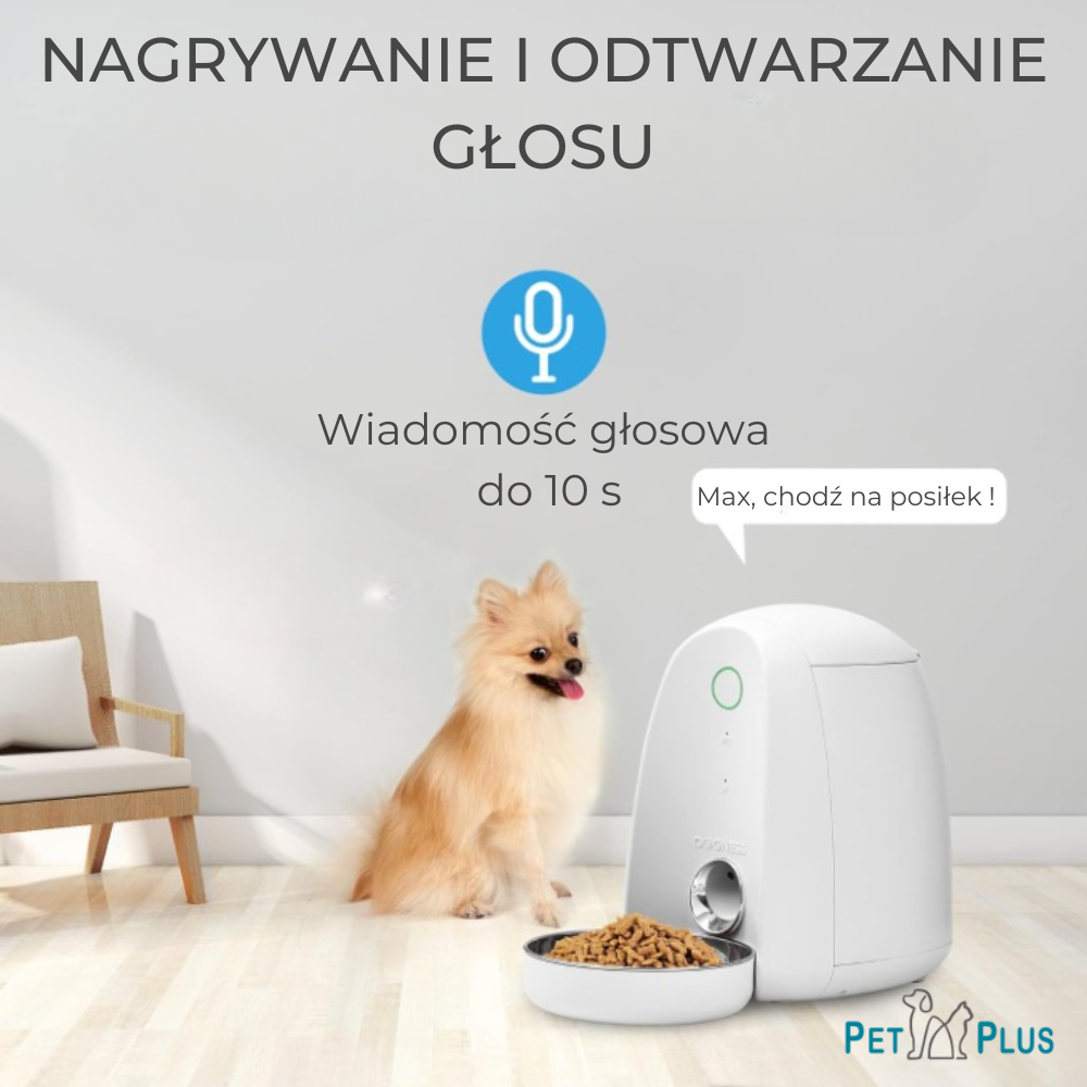 Wbudowany mikrofon i głośnik pozwolą na kontakt z Twoim pupilem. Możesz również nagrać wiadomość głosową, która zostanie odtworzona podczas podawania posiłku.
