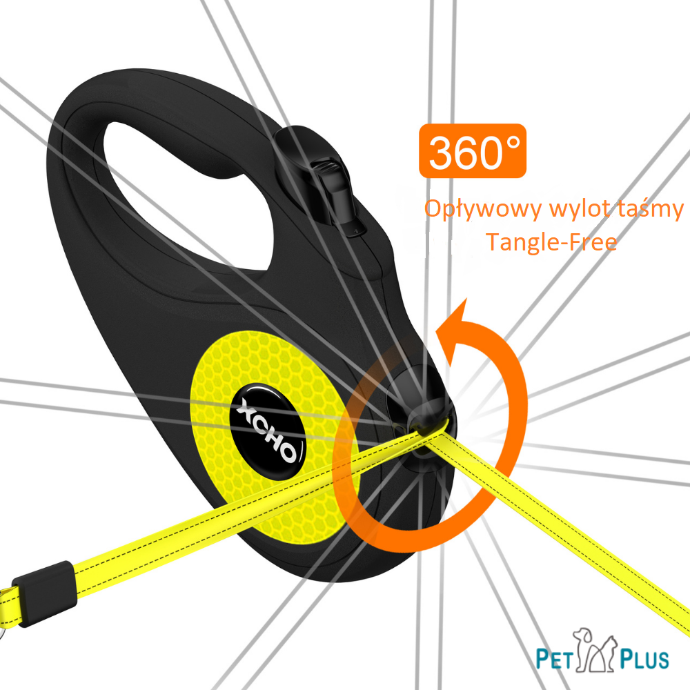 - Smycz posiada niezawodny, bezpieczny i wygodny do kontroli mechanizm zwijający taśmę, który zadba o bezpieczeństwo Twojego psa i innych zwierząt