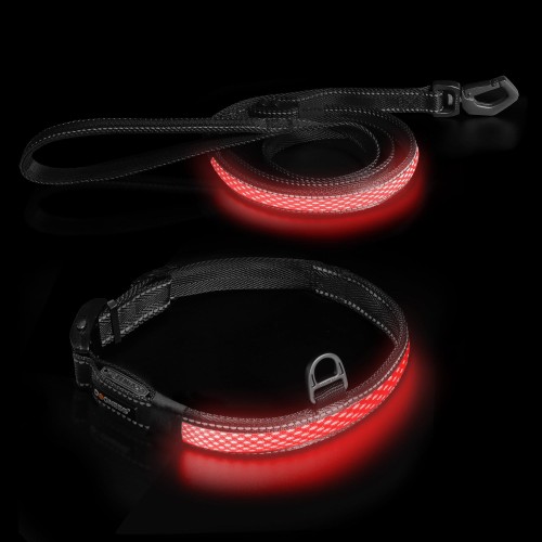 - Obroża i smycz posiadają listwę LED oraz elementy odblaskowe, które zapewnią Tobie i Twojemu pupilowi widoczność i bezpieczeństwo podczas wieczornych spacerów