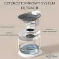 - Urządzenie posiada filtr wymienny czterostopniowym systemie filtracji (warstwa bawełny, warstwa węgla aktywnego, warstwa żywicy jonowej, warstwa bawełny), który usuwa zanieczyszczenia, nieprzyjemny smak i zapach, utrzymując świeżość wody, dzięki czemu jest ona czystsza i smaczniejsza niż woda stojąca w misce. Pompka fontanny chroniona jest dodatkowo przez gąbkę, która wyłapuje większe zanieczyszczenia, tj. włosy, sierść i chroni ją przez uszkodzeniem